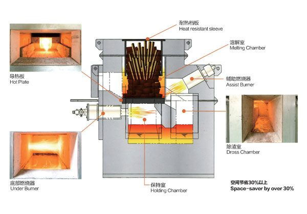 溶解和保溫功能兼用的下部燒嘴,可大幅節(jié)省燃料;利用導(dǎo)熱板間接溶解后燒損及氧化物大幅減少!縮短熔渣清除工作時(shí)間!
