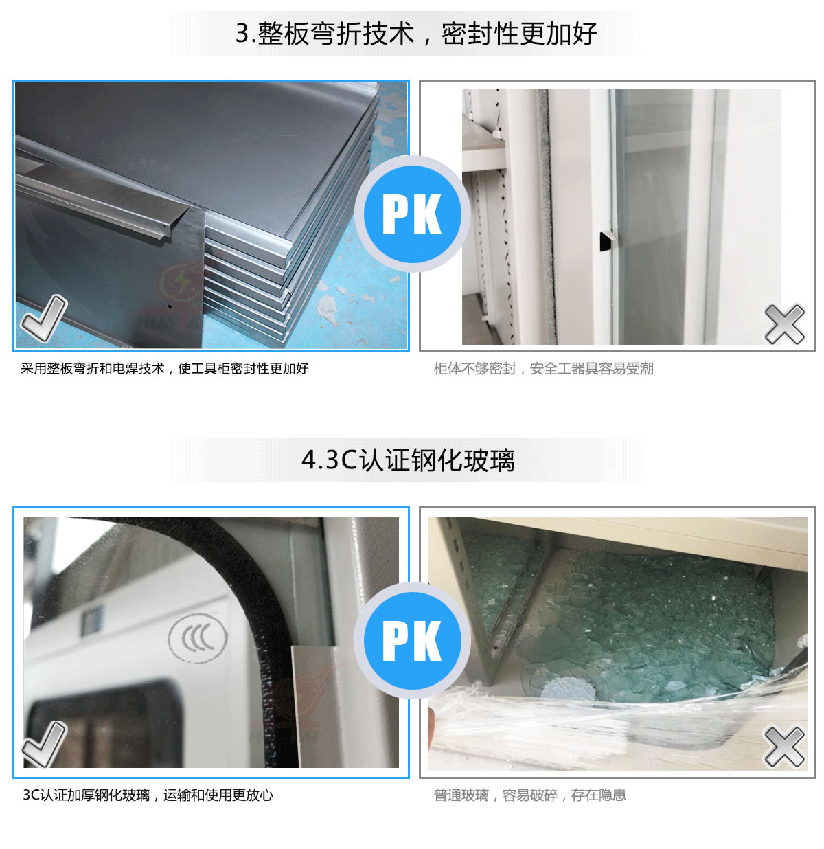 產品外觀:柜體材質為冷軋鋼板,鋼板厚度為1.2mm,柜體自重為75公斤,保證承重強度和站立穩定性。柜體表面為靜電防腐噴塑工藝,顏色為象牙白,柜門裝有通體透明有機玻璃,透過玻璃門可以看到分類有序的各種工器具。