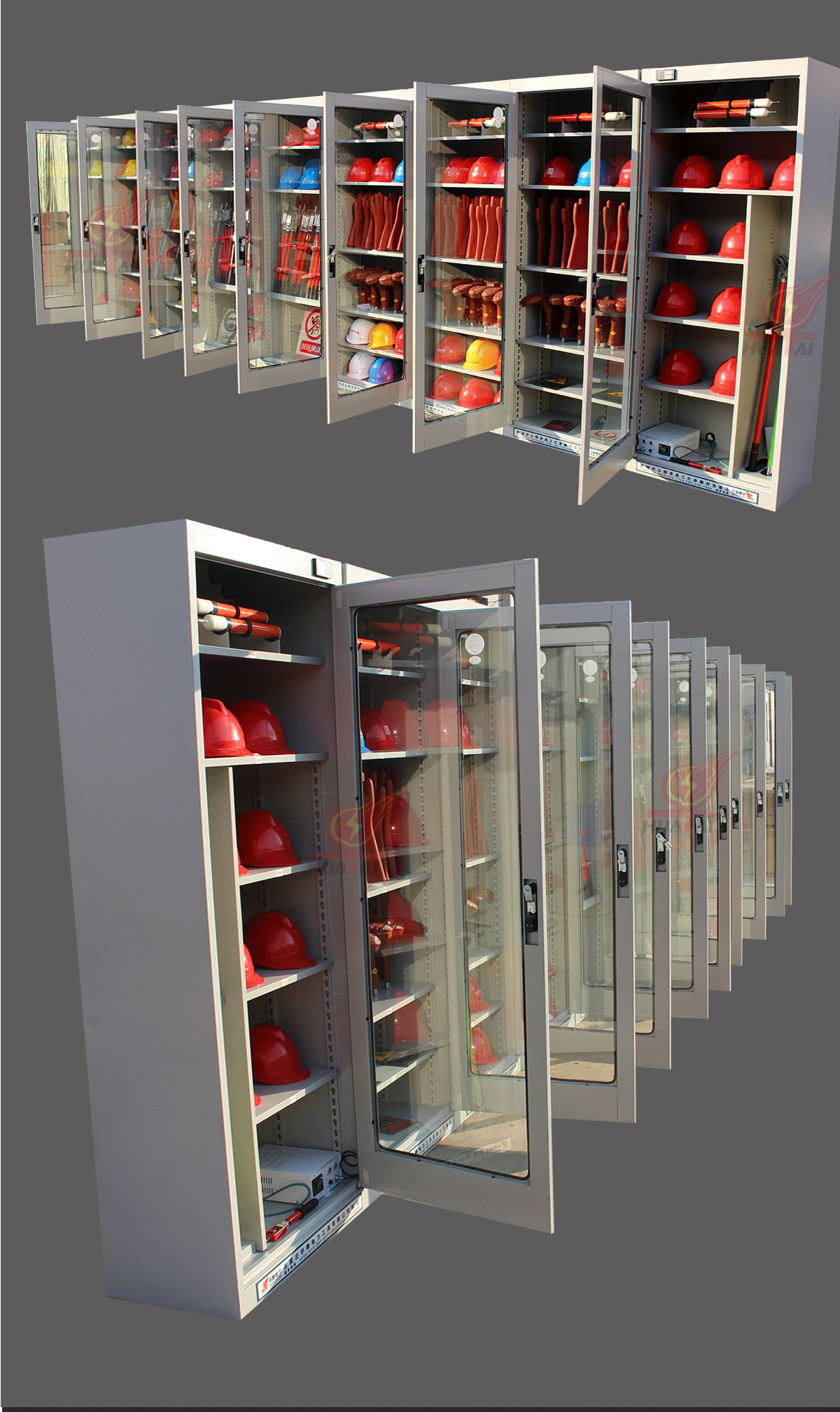 (2)柜體表面為靜電防腐噴塑工藝,顏色為駝灰色,柜門裝有通體透明鋼化玻璃,透過玻璃門可以看到分類有序的各種工器具,便于您的管理。