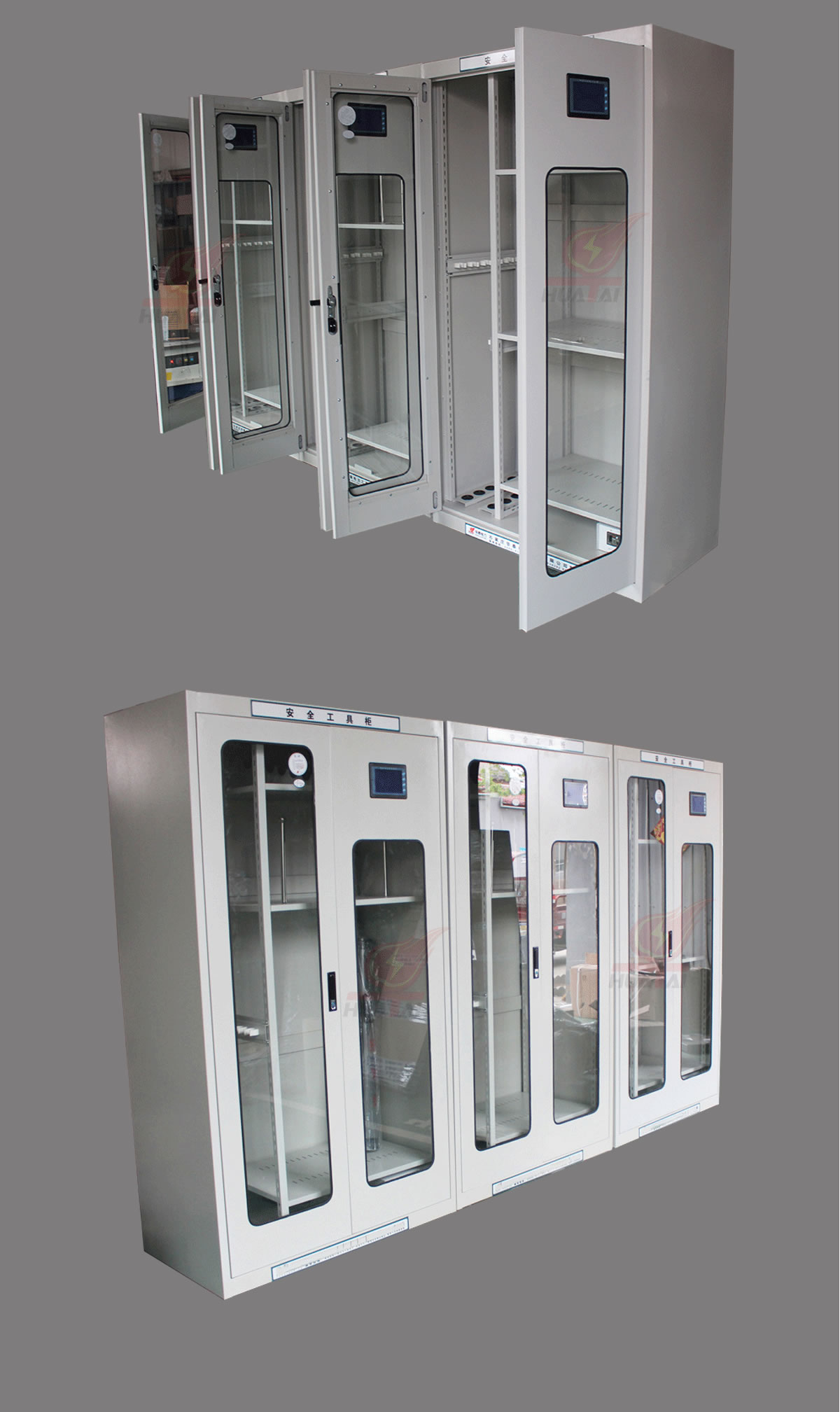 (2)柜體表面為靜電防腐噴塑工藝,顏色為駝灰色,柜門裝有通體透明鋼化玻璃,透過玻璃門可以看到分類有序的各種工器具,便于您的管理。