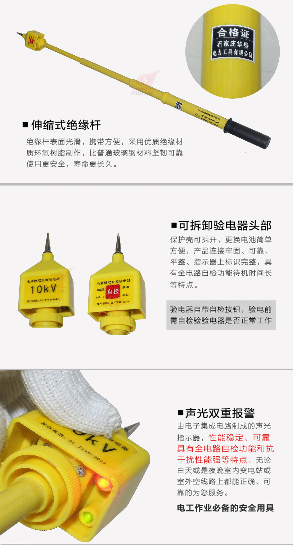 全回路雙自檢交流聲光驗電器是我公司采用國際先進技術和我們雄厚的技術力量以及多年來的制造研究所生產的一款新型交流驗電器,它具有靈敏度高,不受強電場干擾,具有全回路自檢功能,安全系數高,整體采用閉合電路設計,外殼用注塑ABS工程塑料一次成型,桿體延續棒狀伸縮環氧樹脂絕緣桿,耐壓等級及安全系數比傳統驗電器提高3倍。