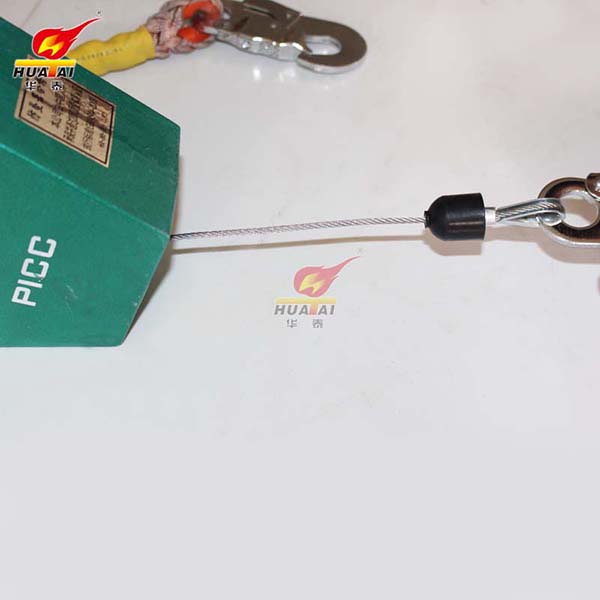 速差式自控器固定懸掛在作業(yè)點(diǎn)上方,將自控器內(nèi)的繩索和安全帶上半圓環(huán)聯(lián)結(jié)可任意將繩索拉出,在一定位置上作業(yè)。工作完畢,人向上移動,繩即自行收回自控器內(nèi)。墜落時自控器受速度影響