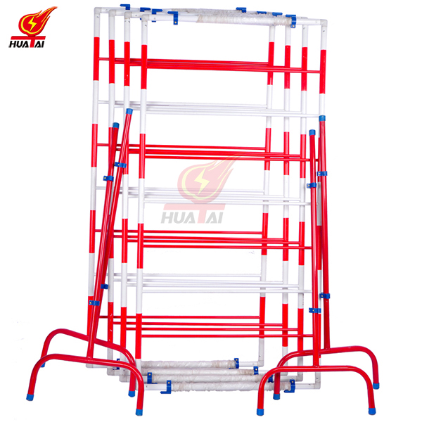 圍網(wǎng)為紅白相間;外形美觀;圍網(wǎng)的上邊沿配“止步,高壓危險(xiǎn)”警示牌; 支撐桿采用鐵桿、不銹鋼、環(huán)氧樹(shù)脂等材料制成, 上面設(shè)有掛鉤或夾子, 可以牢固張掛聚酯網(wǎng), 使之不易被掀起脫離; 底座有鑄鐵和收縮式鐵叉等,可供用戶選擇搭配使用。