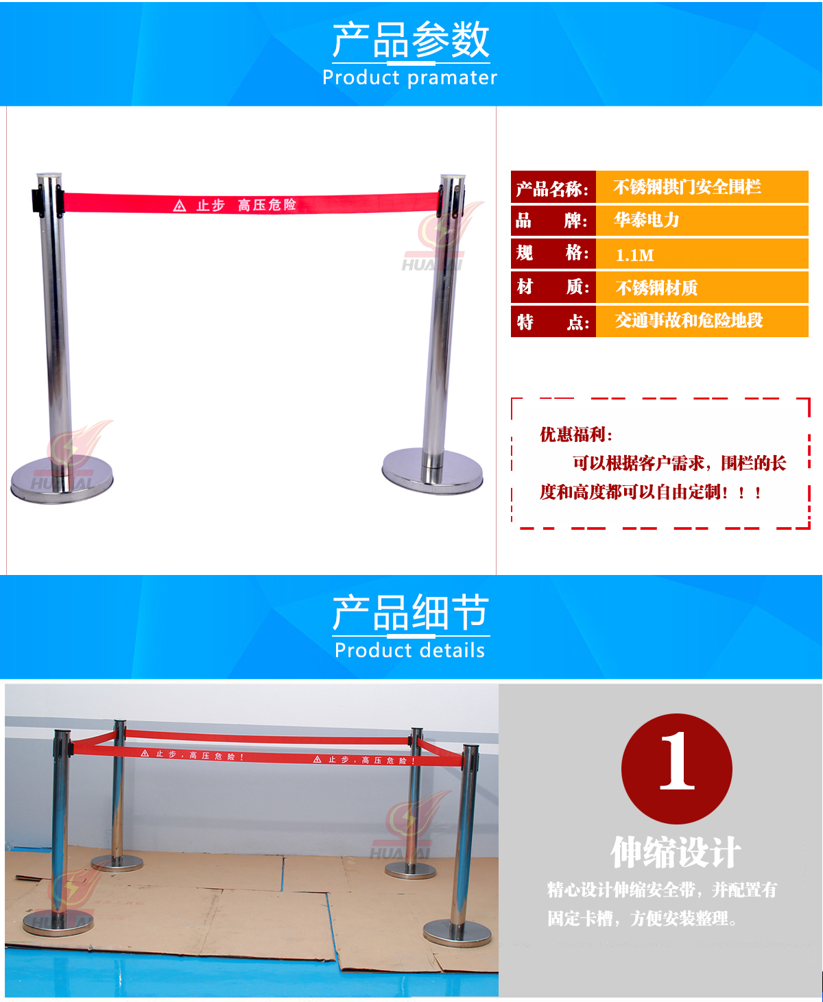 品設(shè)施等。伸縮一米線隔離帶警示圍欄是一種新型安全警示、維護(hù)產(chǎn)品。它是在原來單層伸縮一米線隔離帶警示圍欄的基礎(chǔ)上的改進(jìn)和創(chuàng)新,是新一代的不銹鋼安全圍欄產(chǎn)品,。是電力