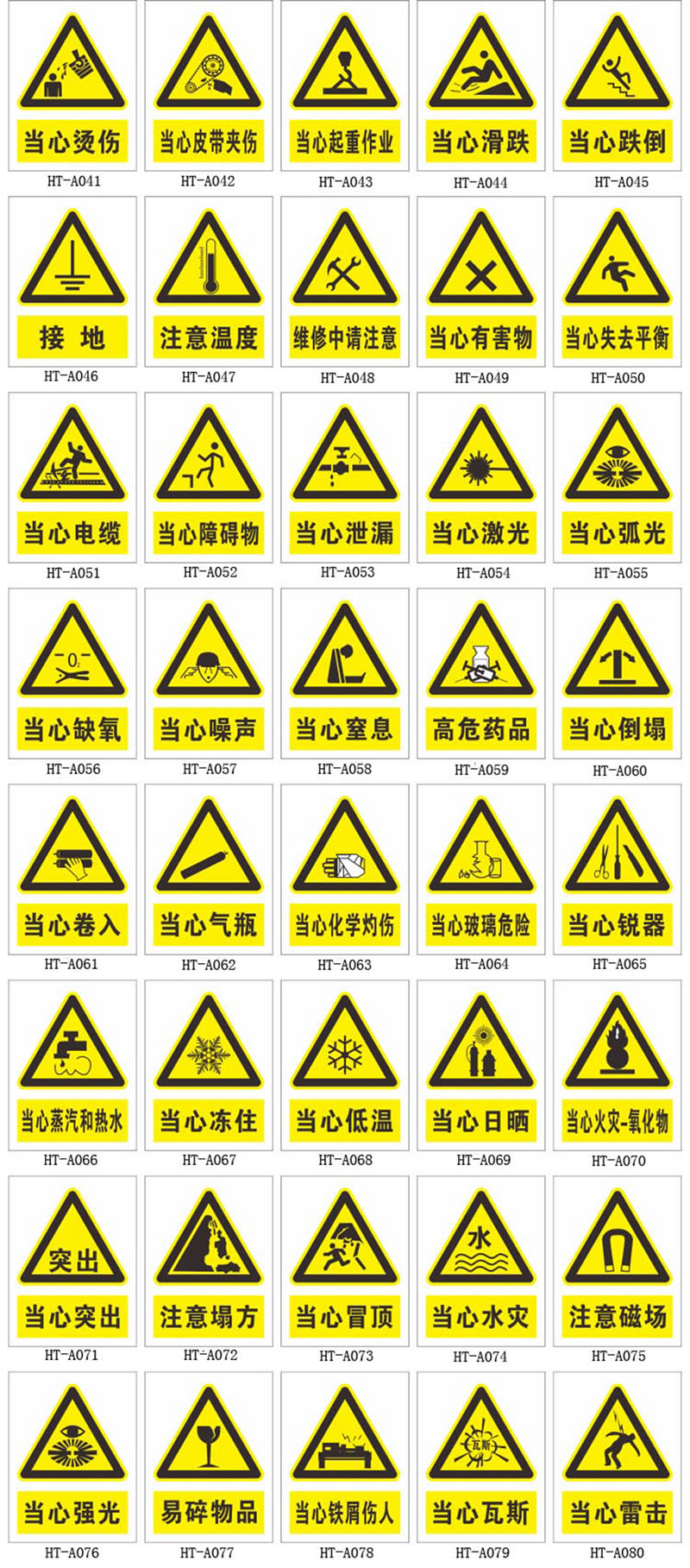 2.警告類PVC材質安全警示牌:通常為等邊三角形(或菱形),黃(白)底黑(紅)邊,黑色(或深藍色)圖案。用于警告駕駛人員注意前方路段存在的危險和必須采取的措施。如預告交叉口、道路轉彎、鐵路道口、易滑路段、可能落石路段、不平路面、合流交通等。