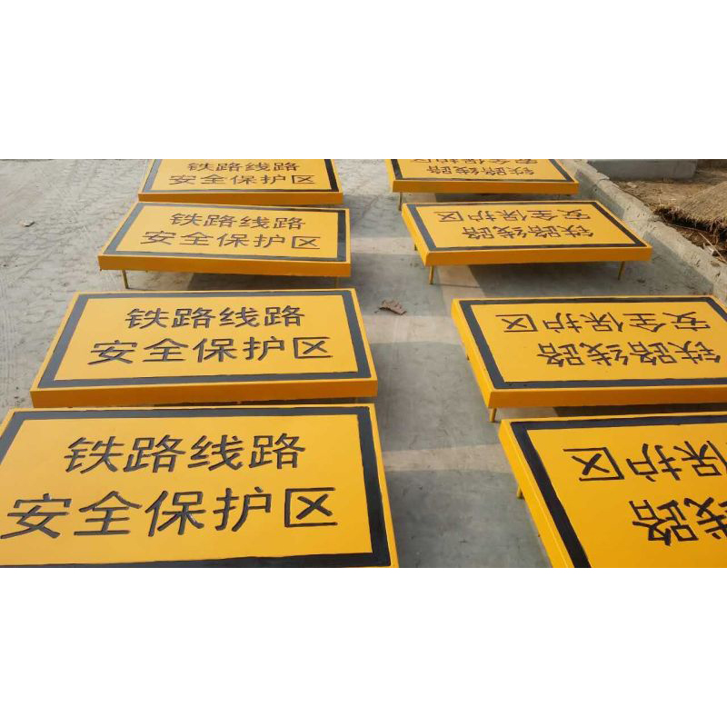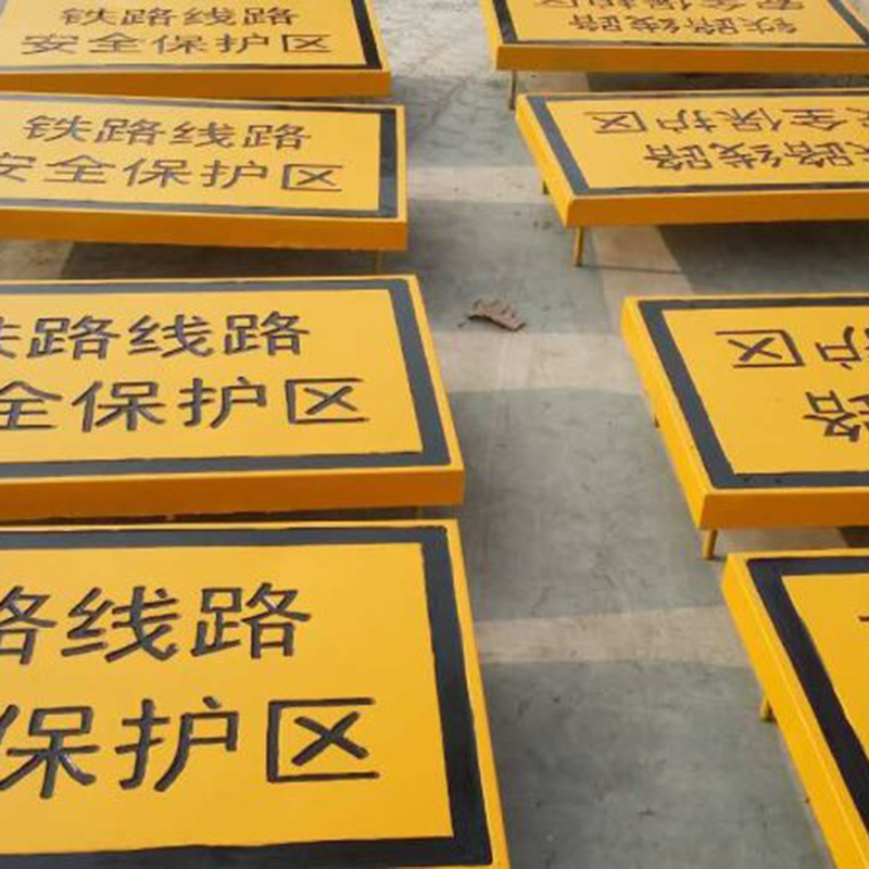 鐵路保護區AB樁材料:灰號為C40的水泥,樁體內部由ф6.0mm螺紋鋼三橫四豎捆綁結構,采用鋼板模具澆筑而成,樁體表面涂有戶外專用白色防水涂料,字體噴紅色涂料。